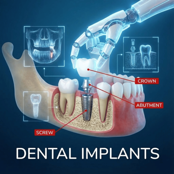 ডেন্টাল ইমপ্লান্ট হলো আধুনিক দন্তচিকিৎসার এমন একটি পদ্ধতি যেখানে হারানো দাঁতের মূলে একটি টাইটানিয়াম পোস্ট বসানো হয়। এটি কৃত্রিম দাঁতের রুট হিসেবে কাজ করে। পরবর্তীতে এর ওপর একটি ক্রাউন বা দাঁত বসিয়ে দেওয়া হয়, যা দেখতে এবং কাজ করতে একদম প্রাকৃতিক দাঁতের মতোই। এটি ব্রিজ বা ডেনচারের তুলনায় অনেক বেশি স্থায়ী এবং আরামদায়ক।
